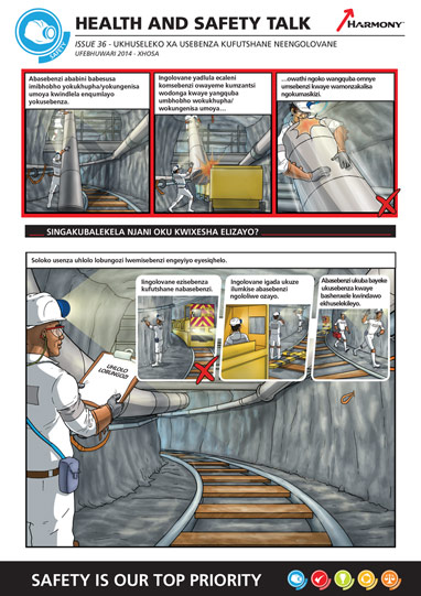 Harmony Gold used comics to effectively engage their site workers. They communicated important messages such as Rigging Safety and Tramming Safety. These Safety Comics were translated into isiXhosa, Sesotho and Setswana.
